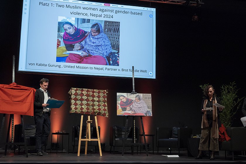 Das Siegerfoto von Kabita Gurung zeigt zwei muslimische Frauen aus einer Selbsthilfegruppe gegen häusliche Gewalt. Eine hilft der anderen beim Ausfüllen eines Dokuments. Für die Jury eröffnet das Bild eine besondere Perspektive, indem es zeigt, dass Unterstützung unter indigenen Frauen aus ihrer eigenen Lebensrealität erwächst – ohne Hilfe von außen.